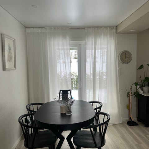 IKEA rundt spisebord i hvit utførelse. Bordet har rund bordplate og fire ben. Passer som spisebord på kjøkken eller i spisestue. Fargen er hvit, og bordet har en glatt overflate med noen synlige merker på bordplaten, som vist på bildene. Og et lite nesten usynlig, fra neglelakk. Men ellers kan sikkert fjernes helt. Er også noe veldig svake merke på ene eller et par stoler men det ser ikke uansett, med mindre en ser og studerer veldig nærme. Ikke vist bilde enda. Ellers i veldig god stand og mye bruk for igjen!