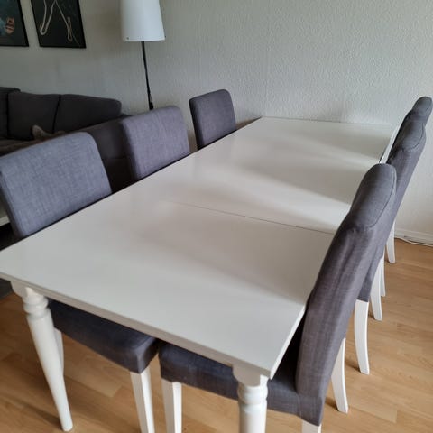Fin spisegruppe med 6 stoler selges. Noen synlige bruksmerker på bordet, men det kan males eller man kan ha en fin duk over:)