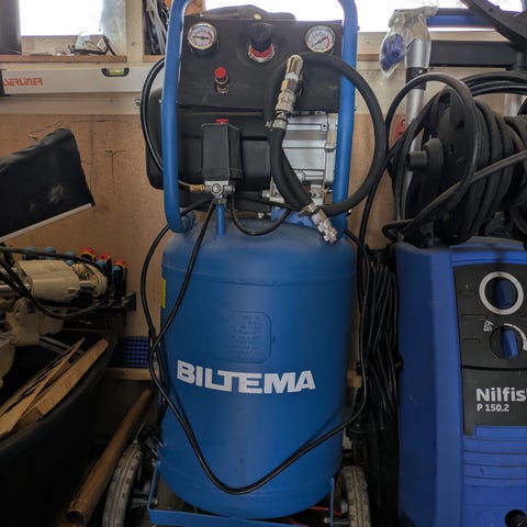 Biltema kompressor med tilbehør. Kompressoren er blå og leveres med spiralslange og manometre for trykkavlesning. Med følger en spiker- og dykkertpistol i gul/svart utførelse, samt en muttertrekker med pipesett i koffert. I tillegg følger det med to sammenleggbare arbeidsbukker i gul/svart som kan brukes som støtte ved saging og annet arbeid. Utstyret egner seg til generelt verksteds- og snekkerarbeid der det er behov for trykkluft og stabile arbeidsstøtter.