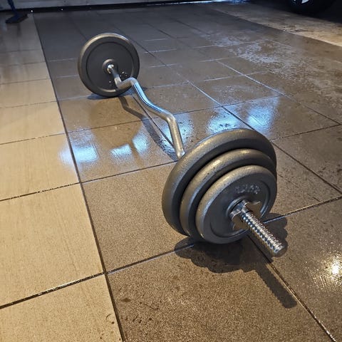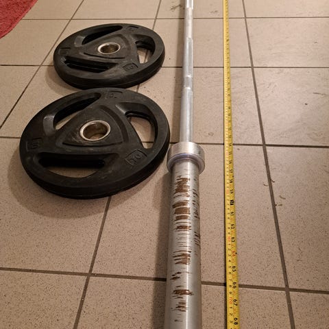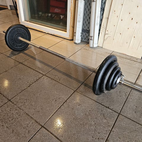 Vektstang med flere vektskiver i metall.