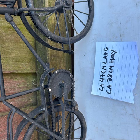 Dekorativ sykkelmodell i metall i svart farge. Modellen har mange detaljer som ramme, pedaler, kjede, bagasjebrett og styre. Egner seg som pyntegjenstand på bord, hylle eller i vitrineskap. Passer i interiør med vintage- eller retro-preg, eller som temadekor for sykkelinteresserte.