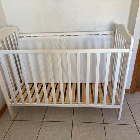 Barneseng Sprinkelseng laget av hvitt tre. Passer for spedbarn og små barn. Designet med spiler for sikkerhet og ventilasjon. Kan justeres i 2 forskjellige høyder.