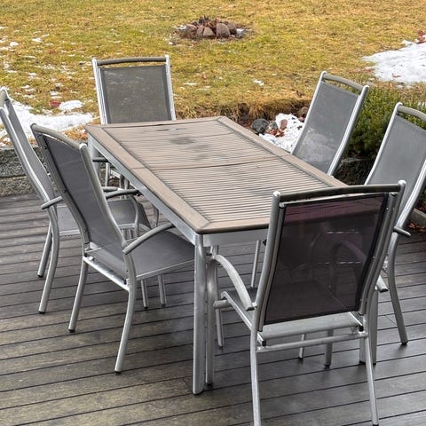 Hagebord med glassplate og stoler i rotting