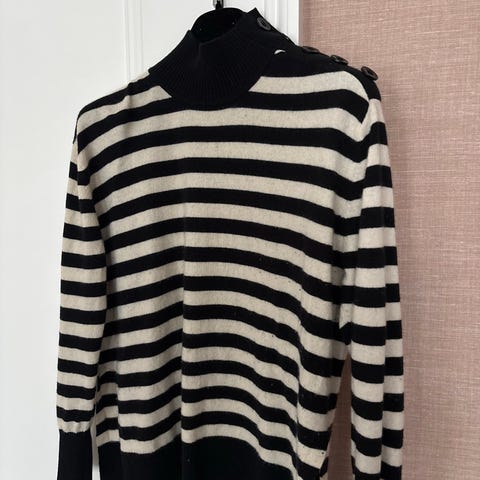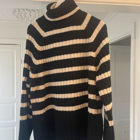 Zimmermann høyhalset genser for dame i størrelse M. Genseren er strikket i ull og Kashmir og har brede horisontale striper i blå og hvit. Den har høy hals med ribbestrikk, ribbestrikkede mansjetter og kant nederst, samt små splitter i sidene for bedre bevegelse. Passer som en varm og behagelig hverdagsgenser. Den har en loose fit.