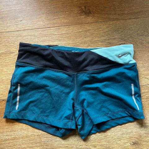 Nike Dri-Fit treningsshorts for dame i størrelse M. Shortsen er grå med oransje linning og er laget i et teknisk materiale med Dri-Fit-teknologi som transporterer fuktighet bort fra huden. Modellen har bred elastisk linning med innvendig snøring for justerbar passform. Det er en liten glidelåslomme bak i linningen til nøkler eller småting. Egnet til fitness, løping og annen trening innendørs og utendørs.