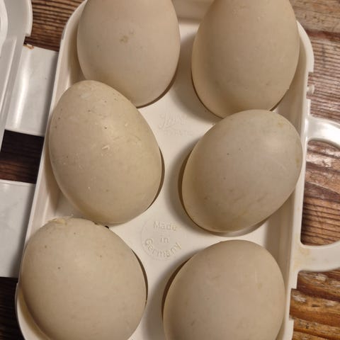Nydelige andeegg fra ender som går fritt hele året og spiser sunt. Vi bruker dem akkurat som hønseegg, men synes smaken er mildere og rett og slett bedre enn hønseegg.
