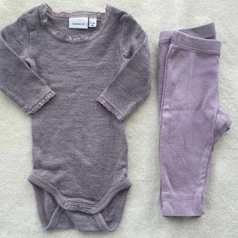 Nydelig ullsett i merinoull med mørkerosa body, og stripete ullbukse med føtter. Myk og god ull, og fin passform. Pent brukt.