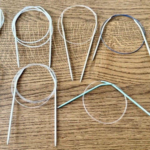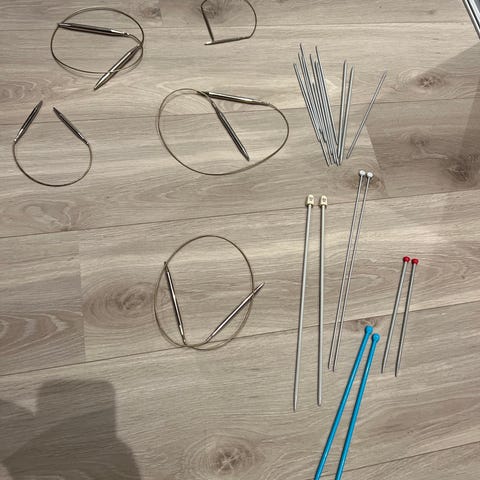 Selger ulike typer strikkepinner. Dette er norske varer og noen er merket NOVI.
