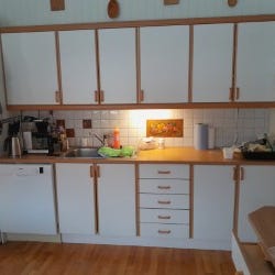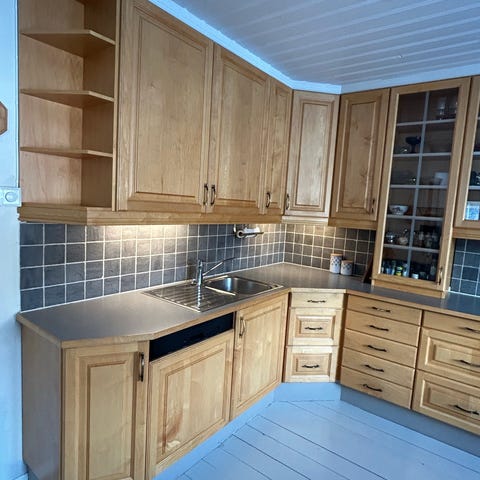 Kjøkkeninnredning med over- og underskap i lys farge og benkeplater i tre. Løsningen består av flere underskap med skuffer og dører, overskap med heldekkende fronter samt enkelte åpne hyller. Innredningen har rette linjer og klassiske profilerte fronter, og passer til et tradisjonelt eller moderne kjøkkenmiljø. Egner seg for gjenbruk ved oppussing eller utskifting av eksisterende kjøkken. Innredningen blir tatt ut senest 14. mars, og man må ta kontakt snarest hvis man ønsker å se dagens plassering i kjøkkenrommet. Inkluderer også komfyr med platetopp (Beha), kjøleskap (Samsung), oppvaskmaskin (Miele) og oppvask i metall eks blandebatteri (Intra)