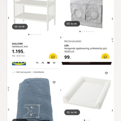 IKEA stellebord i tre med naturfarget finish. Stellebordet har en øvre stelleflate med kant rundt, og en nedre hylle til oppbevaring av bleier, klær og annet stelleutstyr. Egnet til stell av baby og småbarn. Kan plasseres på bad, barnerom eller annet egnet rom med plass til stelleutstyr. Bleiebøtte, bøtteposer og stellematte kan medfølge kjøpet hvis kjøper henter selv.