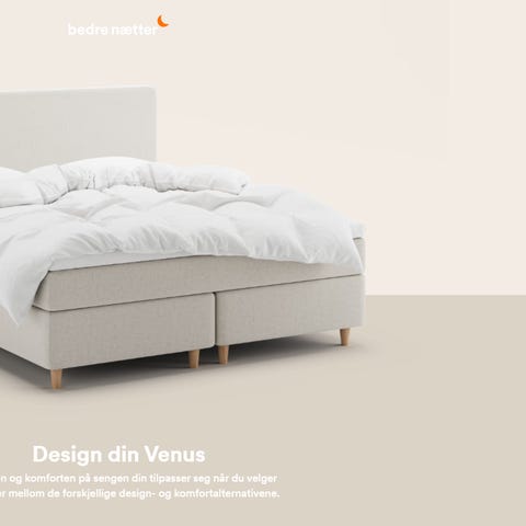 Kontinentalseng av merket Venus fra Bedre Nætter i størrelse 180x200 cm. Sengen har polstret hodegavl og understell trukket i beige tekstil. Overmadrassen er hvit med mønster. Sengen står på høye treben som er byttet med de originale lavere trebeina (begge følger med og kan byttes etter ønske). Det er plass til skuffer under sengen med de høye beina.