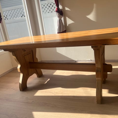 Selger et stort og solid stuebord i heltre gran/furu. Bordet er bygget i en rustikk stil med brede planker og kraftige bein med gjennomgående tapp-løsning. Naturlig treverk gir et varmt og robust uttrykk, perfekt til stua.