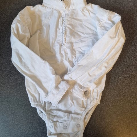 Kjempesøt body i bomull. Passer til bunad, festdrakter eller lignende. Ingen flekker eller hull. Vil tro denne passer også str 80, da den er litt knapp i str.