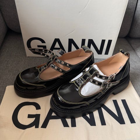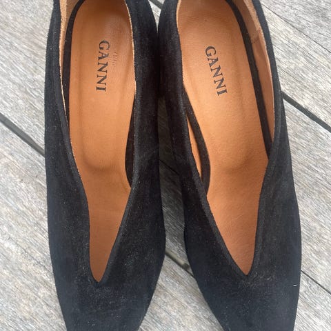 Ganni pensko i størrelse 37. Super sko som kan brukes både til hverdag og til fest. Skoene har spiss tå og åpen hæl med rem rundt ankelen. Overdelen er i svart materiale med preget mønster og store spenner med metallmaljer. Sålen er flat bak med liten hel. Passer som pene sko til bruk ved ulike anledninger der man ønsker en mer oppkledd stil.