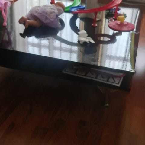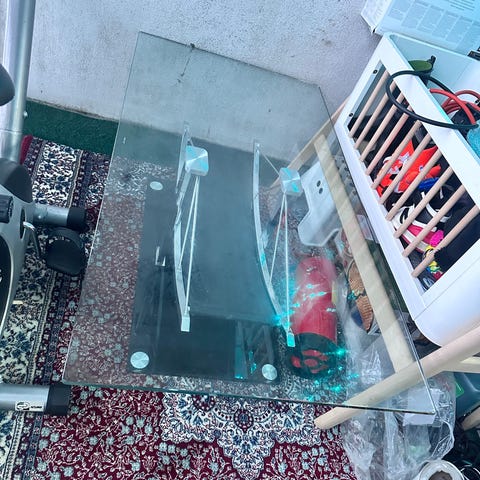 Skrivebord hjørne. Lilla farge glass.