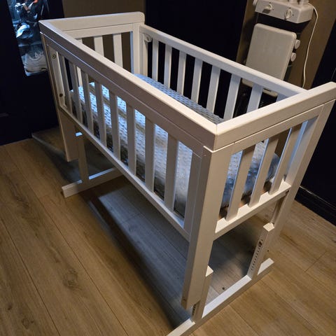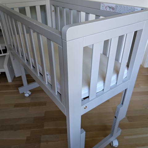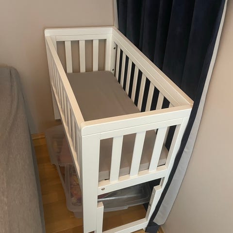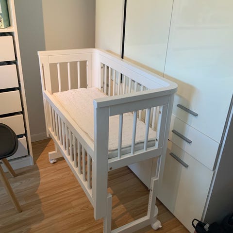 Kan justere høyde og ta ned en vegg for bruk mot seng.