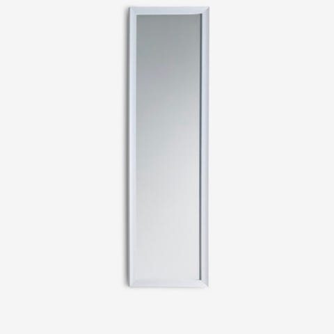 IKEA speil i helfigur med hvit ramme. Speilet er rektangulært og egner seg til bruk i gang, soverom eller garderobe for å se antrekk i full høyde. Kan plasseres stående mot vegg eller monteres på vegg etter behov, avhengig av type oppheng som brukes.