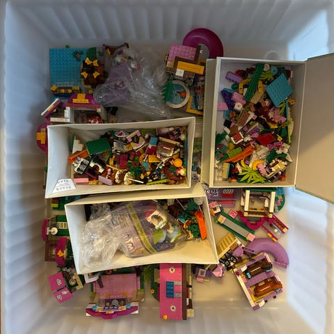 LEGO Friends blandet sett med klosser, minidukker og deler fra flere ulike byggesett. Inneholder et utvalg fargerike LEGO-elementer, figurer og tilbehør som kan brukes til å bygge og kombinere ulike Friends-miljøer. Egner seg for barn som liker rollelek og bygging med LEGO Friends-tema. Antall deler og komplette sett er ikke spesifisert, og innholdet består av en miks av ulike LEGO Friends-komponenter slik som vist på bildene.