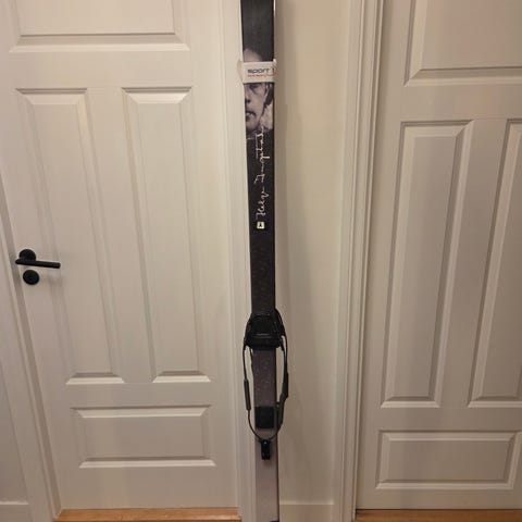 Denne skien er en gave jeg ikke bruker. De har hatt lett bruk og er i utmerket stand. Det er gamle skimonteringshull som har blitt fylt med tre og harpiks.