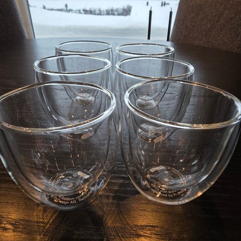 Bodum Pavina glass med dobbeltvegget konstruksjon i klart glass. Egnet til varme og kalde drikker som kaffe, te og andre drikker. Dobbeltveggen bidrar til å holde drikken varm eller kald lenger og gjør glasset behagelig å holde i. Passer på kjøkkenet, til servering ved bordet eller til hverdagsbruk. Har 6 stk av liten og stor. 50 pr stk.