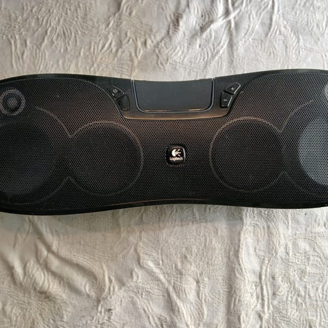 Logitech høyttalerdokk for iPod. Enheten har innebygde stereohøyttalere og dokkingkontakt tilpasset eldre iPod-modeller med dokkekontakt. På fronten finnes knapper for grunnleggende styring av avspilling og volum. Høyttalerdokken kan brukes som stasjonær avspiller for musikk fra kompatible iPod-enheter. Strømtilkobling og eventuelle andre tilkoblinger fremgår av merkingen på baksiden av enheten.