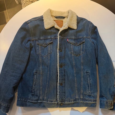 Levi's denimjakke for herre i størrelse L. Jakken er svart og laget i denim. Innsiden har mykt fôr som gir ekstra varme. Klassisk jeansjakkemodell med krage, knappelukking foran og brystlommer med klaff og knapp. Egnet som ytterjakke i kjøligere vær.