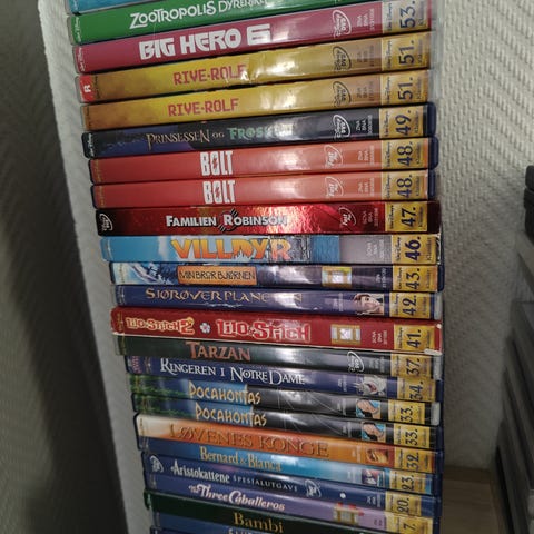 Disney DVD samling med flere klassiske og nyere animasjonsfilmer. Bildene viser blant annet titler som Snøhvit, Pinocchio, Fantasia, Dumbo, Bambi, Alice i Eventyrland, Peter Pan, Lady og Landstrykeren, Tornerose, 101 dalmatinere, Den lille havfruen, Skjønnheten og udyret, Aladdin, Løvenes konge, Pocahontas, Ringeren i Notre Dame, Herkules, Tarzan, Keiserens nye stil, Atlantis, Lilo & Stitch, Bolt, Frost og andre Disney- og Pixar-relaterte filmer. Alle filmer er på DVD-format med originalt cover. Egner seg for samlere eller som familie- og barnefilmer i hjemmekino. Disse er kjøpt over en periode på 25 år, 53 filmer. Selges for 2500 pluss porto evt bud hvis flere er intr