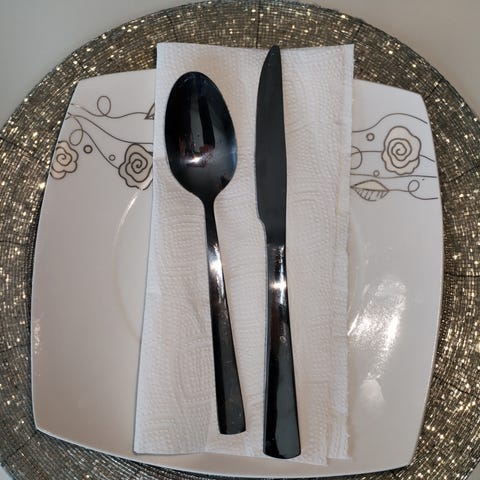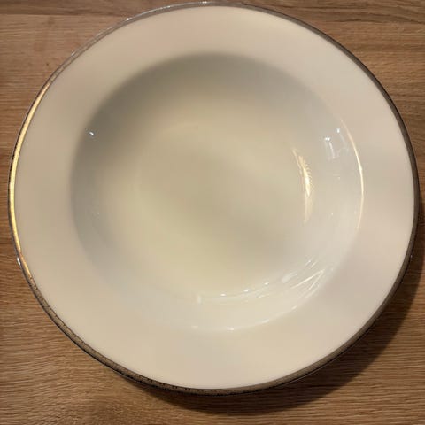 Pent hvitt, med en bølge på siden. Liten tynn gullkant. Diameter 24 cm på tallerken