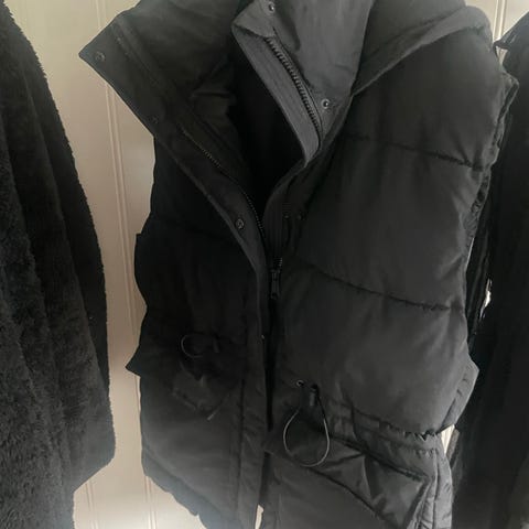 H.M vattert vest for dame i størrelse M. Vest i svart farge, laget i polyester. Lang modell med glidelåslukking foran. Egnet som ytterplagg på kjøligere dager eller som et ekstra lag over genser eller genserjakke.