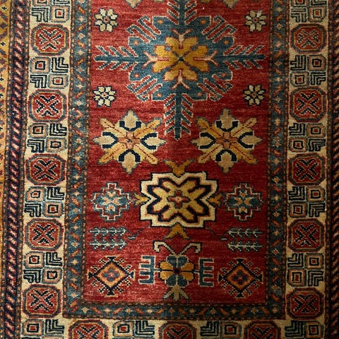 teppe med flerfarget, orientalsk-inspirert mønster i røde, gule og mørke nyanser. Rektangulær form som passer i stue, soverom eller andre oppholdsrom. Tekstilet består av flere felt med ulike dekorative mønstre som gir et patchwork-preg. Egnet som gulvteppe for å skape et markert blikkfang i rommet.