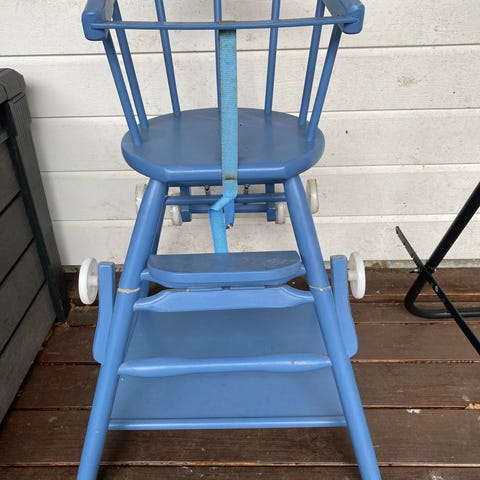 Eldre type barnestol, lignende til tripp trapp. I tre, stødig.