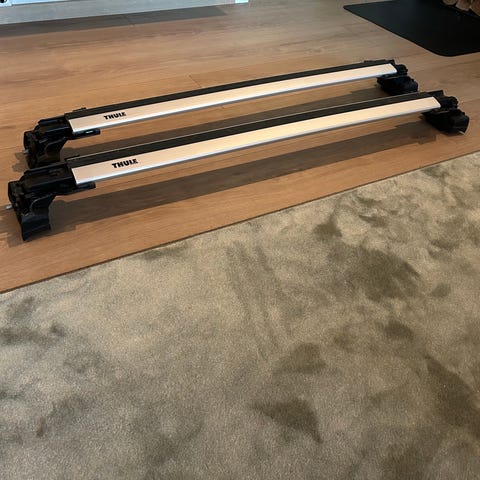 Thule squarebar, brukt på Mitsubishi outlander phev 2014. Passer som jeg forstått Outlander 2013 - 2021. Nøkkel finnes.