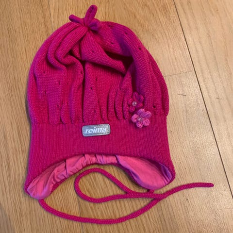 Reima lue til jente i størrelse 46. Luen er strikket i lilla ull og har øreklaffer og knyting under haken for bedre passform. Innside i mykt stoff for økt komfort. Dekorative blomsterdetaljer på siden og Reima-logo foran.
