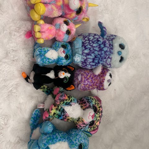 Ty kosedyr sett. Pakken inneholder flere myke kosedyr i ulike dyrefigurer og størrelser, blant annet enhjørning, hund og katt. Kosedyrene er laget i mykt tekstilmateriale med store øyne og ulike farger. Egnet som lekekosedyr eller pyntegjenstander på barnerom.