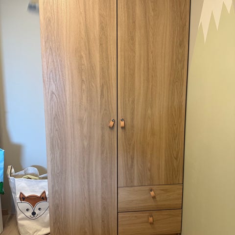 IKEA skap med to dører i lyst treutseende og hvit underdel. Skapet egner seg til oppbevaring i for eksempel soverom, barnerom eller gang. Designet er enkelt og funksjonelt, med et nøytralt uttrykk som passer inn i ulike interiørstiler.