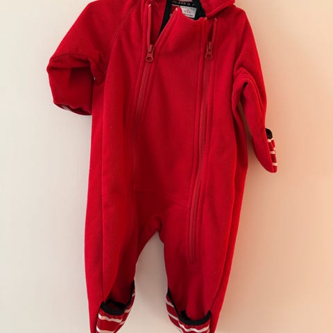 Selger en fleeceheldress fra Polarn O. Pyret i størrelse 62. Heldressen er rød med kontrastdetaljer og hette med stripet fôr. Egner seg spesielt godt for bæring i overgangssesongene.