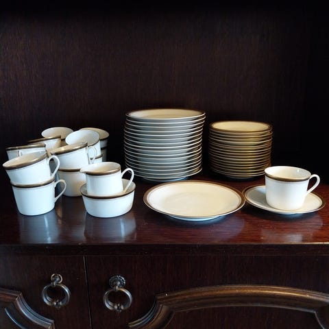 Elegant hvitt porselen med diskret grått rutemønster og gullkant. Tidløst og stilrent design.