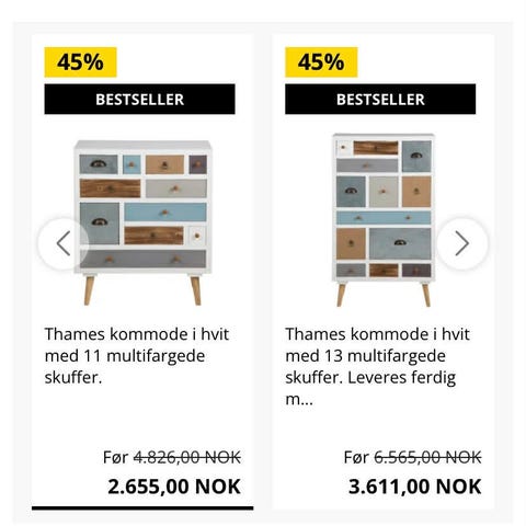En stor, tung og massiv kommode, men fremstår allikevel så nett og fin med de avrundede kantene. En helt nydelig kommode! Kjøpt på Ellos for 9799kr. Brukt til sengetøy på barnerom. Lite brukt, fremstår som veldig fin. Er noen merker på den (se bilder), skrapte litt borti da vi flyttet den opp en trappegang. Sjenerer ikke.