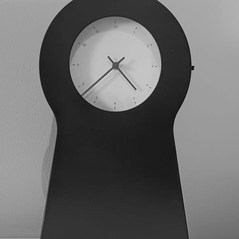 IKEA bordklokke med rund urskive og glasskuppel. Klokken har hvit tallskive med svarte tall og visere på forsiden, og mørk bakside. Fot og klokkehus er i metall med messingfarget finish. Glasskuppelen står på en rund metallbase i samme farge og beskytter klokken mot støv. Egnet som bordklokke eller dekorativt innslag i interiøret.