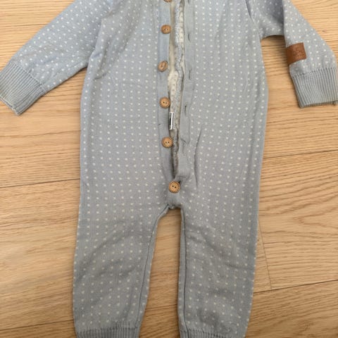 Lillelam heldress i ull i blå farge, unisex, størrelse 62. Dressen har glidelås foran. Sett med tilhørende lue, votter og sokker i samme blå ullmateriale. Passer til baby i størrelse 62/68 og er egnet som ytterplagg eller mellomlag i kjøligere vær.