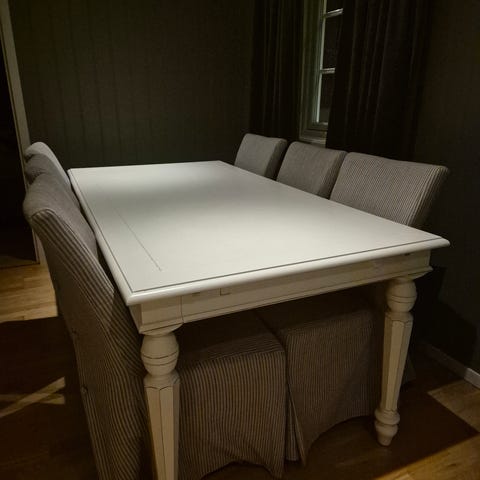 Selva spisebord med 8 stoler, stort vitrine skap og skjenk selges komplett eller separat