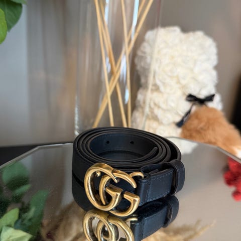 Gucci belte for unisex. Beltet har svart lærkant kombinert med tekstilbånd i grønn og rød stripe langs midten. Spennen er i metall med rund form og åpent dobbelt G-design. Passer til bruk i bukser og jeans for både hverdag og mer formelle antrekk. Lengde 100 cm og 40 mm bredde.