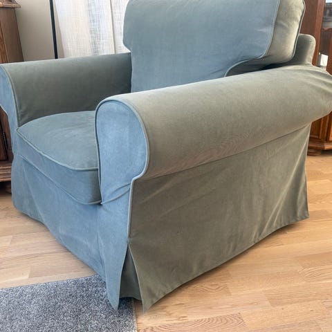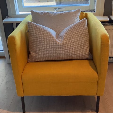 Liten flekk på armlene og litt merker etter katt på baksiden se bilder. (Pute og skinn medfølger ikke)