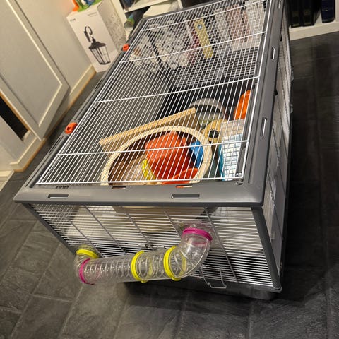 Hamsterbur med løpegård og tilbehør