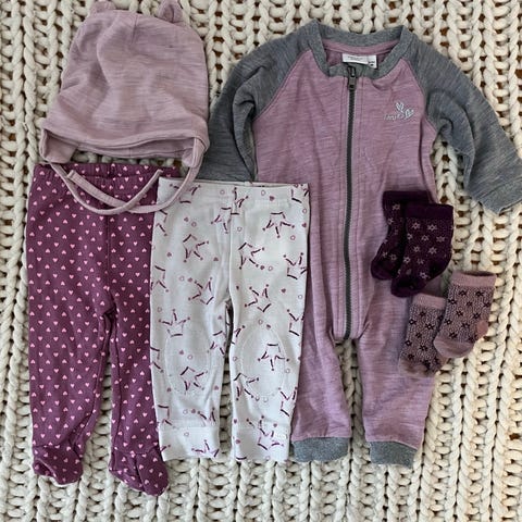 Nydelig liten klespakke i ull til jente. Alt er pent brukt, eneste anmerkning jeg kan se er at bodyen har en løs knapp på skuldra. Den holdes fint igjen med den andre knappen.