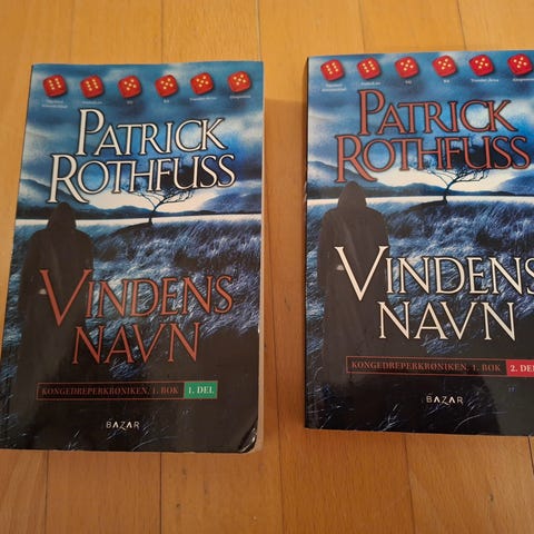 Name of the wind av Patrick Rothfuss, norsk oversettelse bok 1 del 1 og 2. Første del av populær fantasy serie. Ubetydelig vannskade på del 1. Sendes for kjøpers regning.