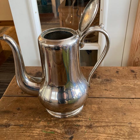 Tekanne i metall med gullfarget overflate. Kannen har buet hank, lang helletut og lokk med toppknapp. Den står på fire små ben med dekorative ornamenter på sidene. Inneholder ca 1liter.