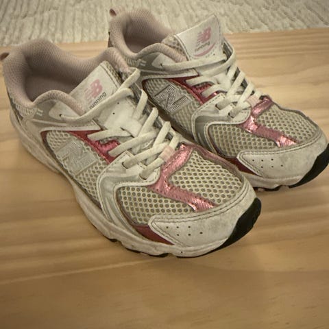 New Balance joggesko/sneakers for barn i størrelse 34,5. Kjøpt nye av meg i 2025 og brukt til ett barn. Snøring i strikk så man slipper knyting. Selges rimelig da de trenger en vask