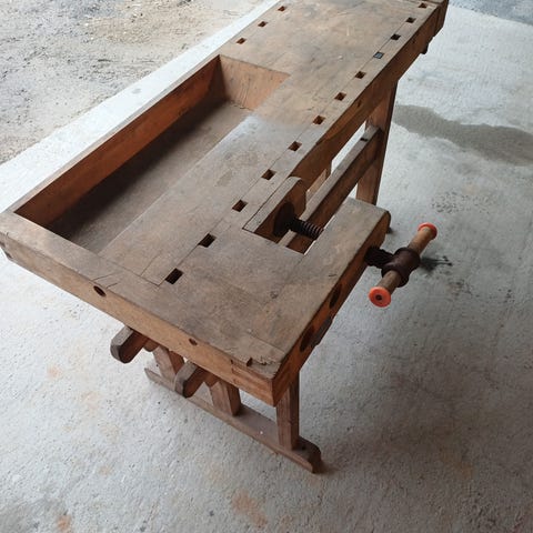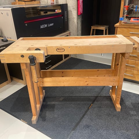 Hamran arbeidsbenk i tre. Solid benk med kraftig plate og tradisjonell tre- og metallskruestikke i front. Benken har hull for benkehaker langs forkant og bakre del av platen, samt hylle under for oppbevaring av verktøy og materialer. Egnet som arbeidsbenk for snekkerarbeid, hobbyverksted eller annet håndverksarbeid i verksted eller garasje.
