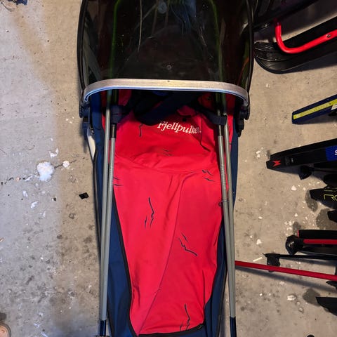Fjellpulken Nordic barnepulk med vindskjerm. Pulken har hardt karosseri og trekk i tekstil med rød, grå og sølvfarget overdel. Integrert vindskjerm foran beskytter barnet mot vær og vind. Egnet for transport av barn på ski- og vinterturer, med plass til barn som kan ligge eller sitte godt beskyttet i pulken. Pulken har dragfester foran for montering av drag eller sele etter behov.